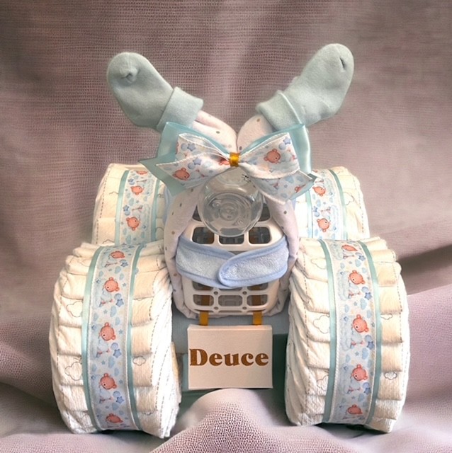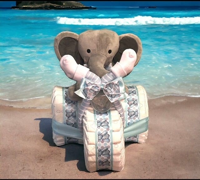 Current Best Seller!!!! Constructed of 60 Pamper Swaddlers Size 1, 1 receiving blanket, a 9 oz tommee tippee baby bottle, 1 package of Johnson’s face and hand wipes, 1 pair of baby socks, 1 plush elephant, with ribbons and bows to match!