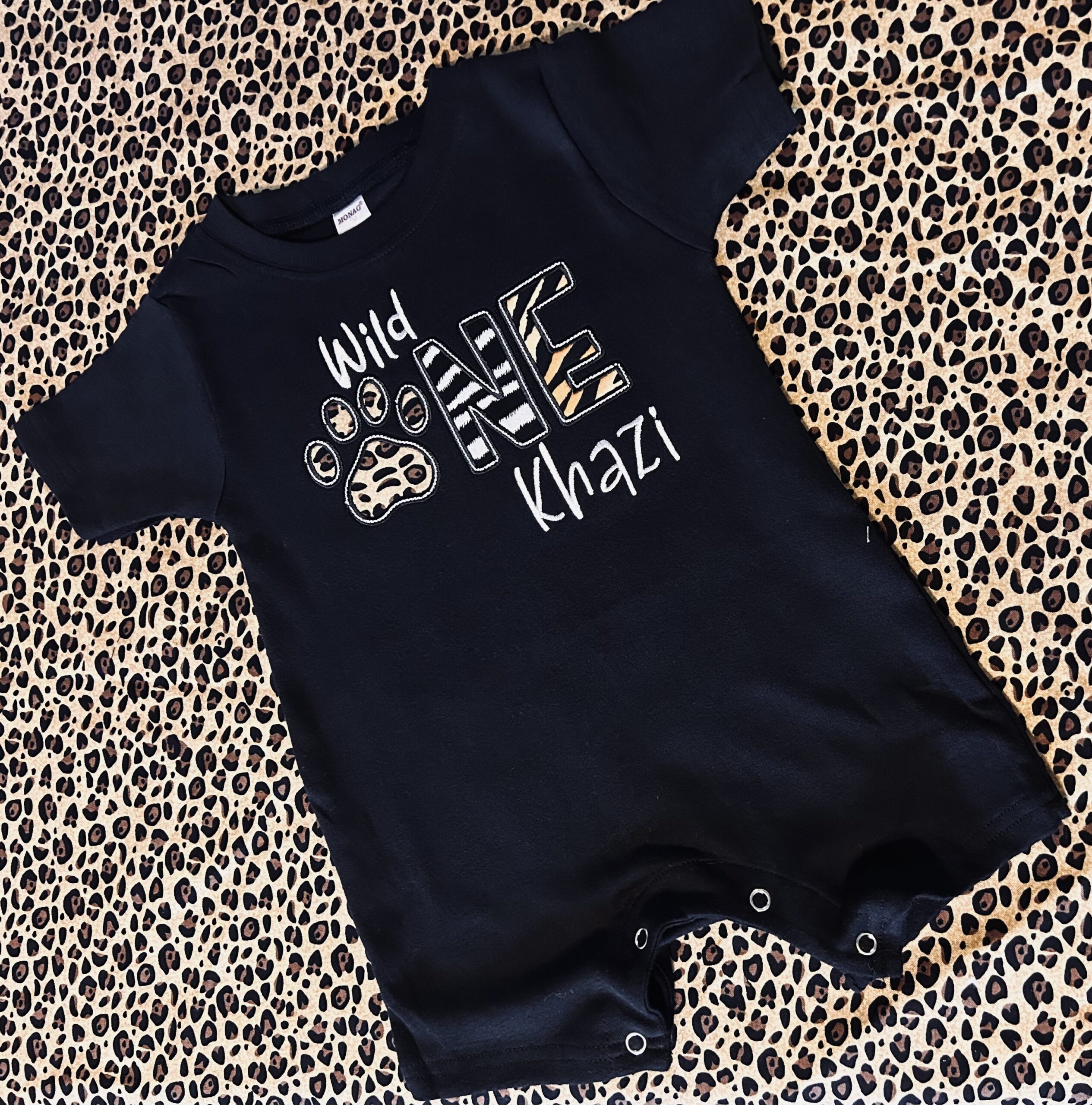 This Boys Romper is sure to be the hit of a special little boy’s first Birthday Party! It is 100% cotton and is available in Black, White, and Gray sizes 3 month-3T. It is an embroidered design personalized with a first name. Don’t miss the chance to celebrate your wild one with this comfy romper.