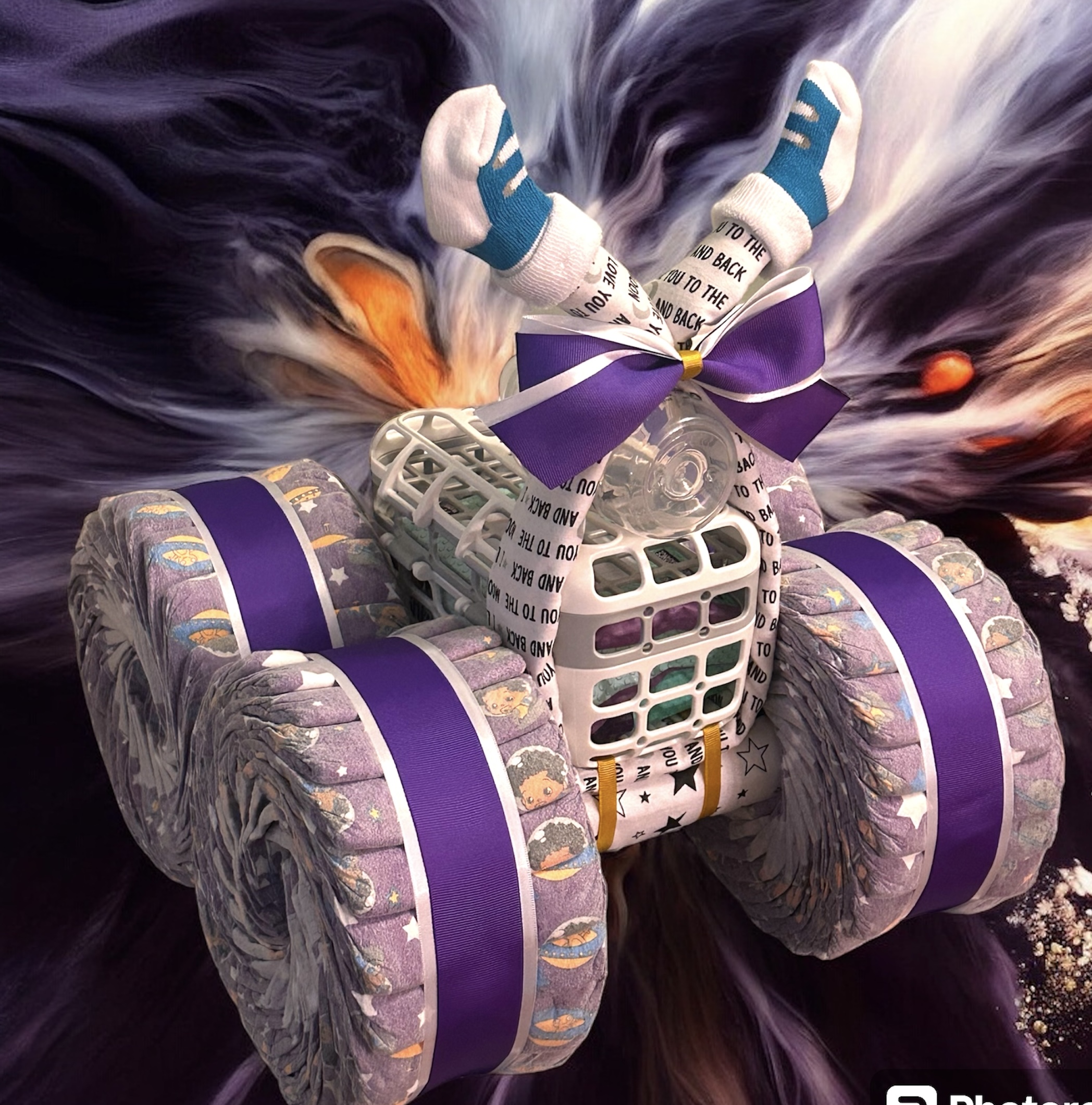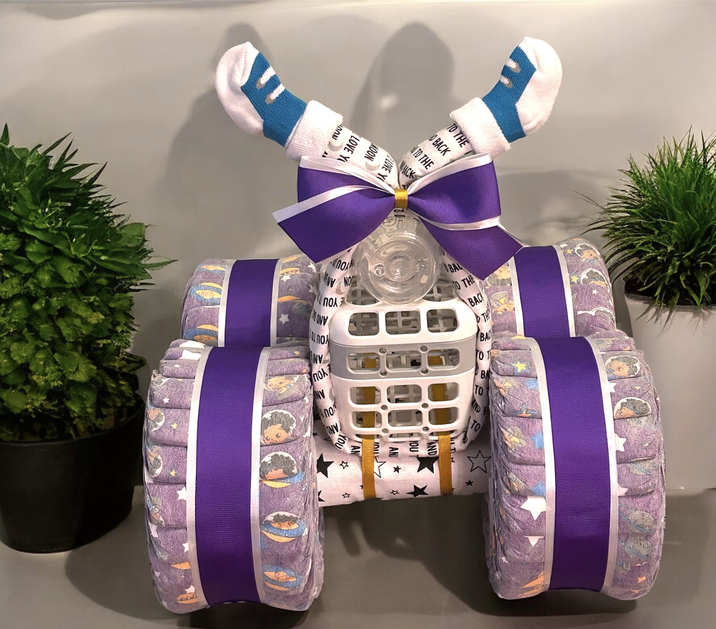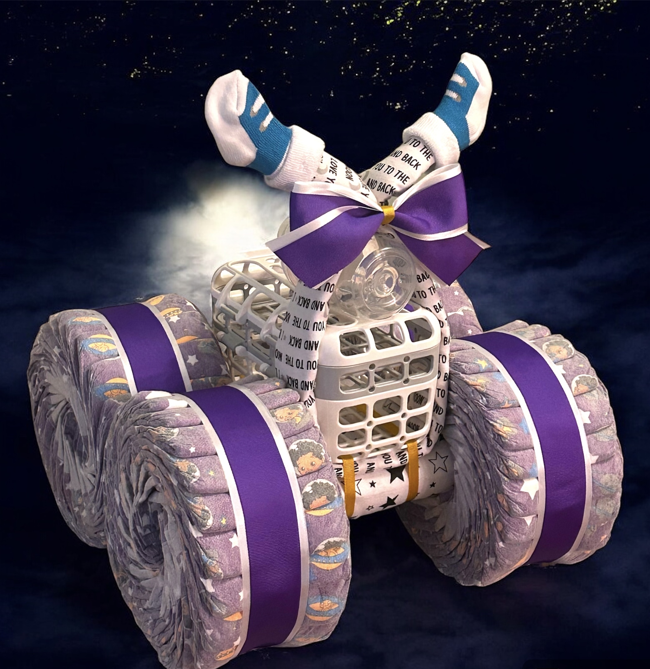 This Diaper 4 Wheeler Tinky Poo is the perfect gift for a precious little one and now it’s available with Tinky Poo Space Invaders Diapers! It is constructed of 80 size 2 Tinky Poo Space Invaders Diapers, 1 baby dishwasher basket, 1 tommee tippee baby bottle, 2 receiving blankets, and 1 pair of baby socks!You can also choose to customize an embroidered bib or add a personalized name plate to the front.This Diaper Impression Tinky Poo favorite is guaranteed to ride right into the hearts of any new baby and parents to be!