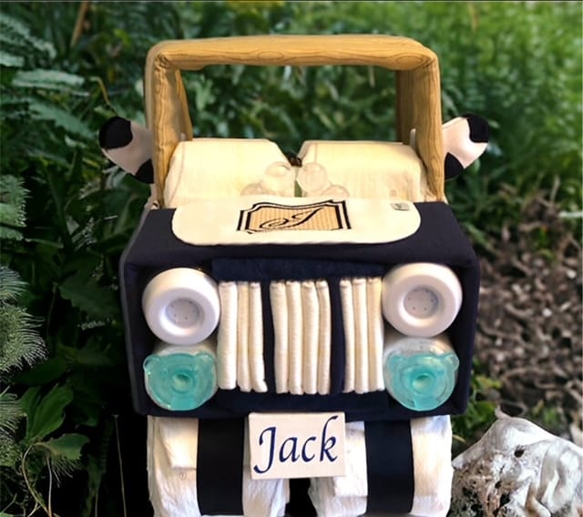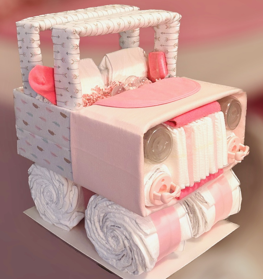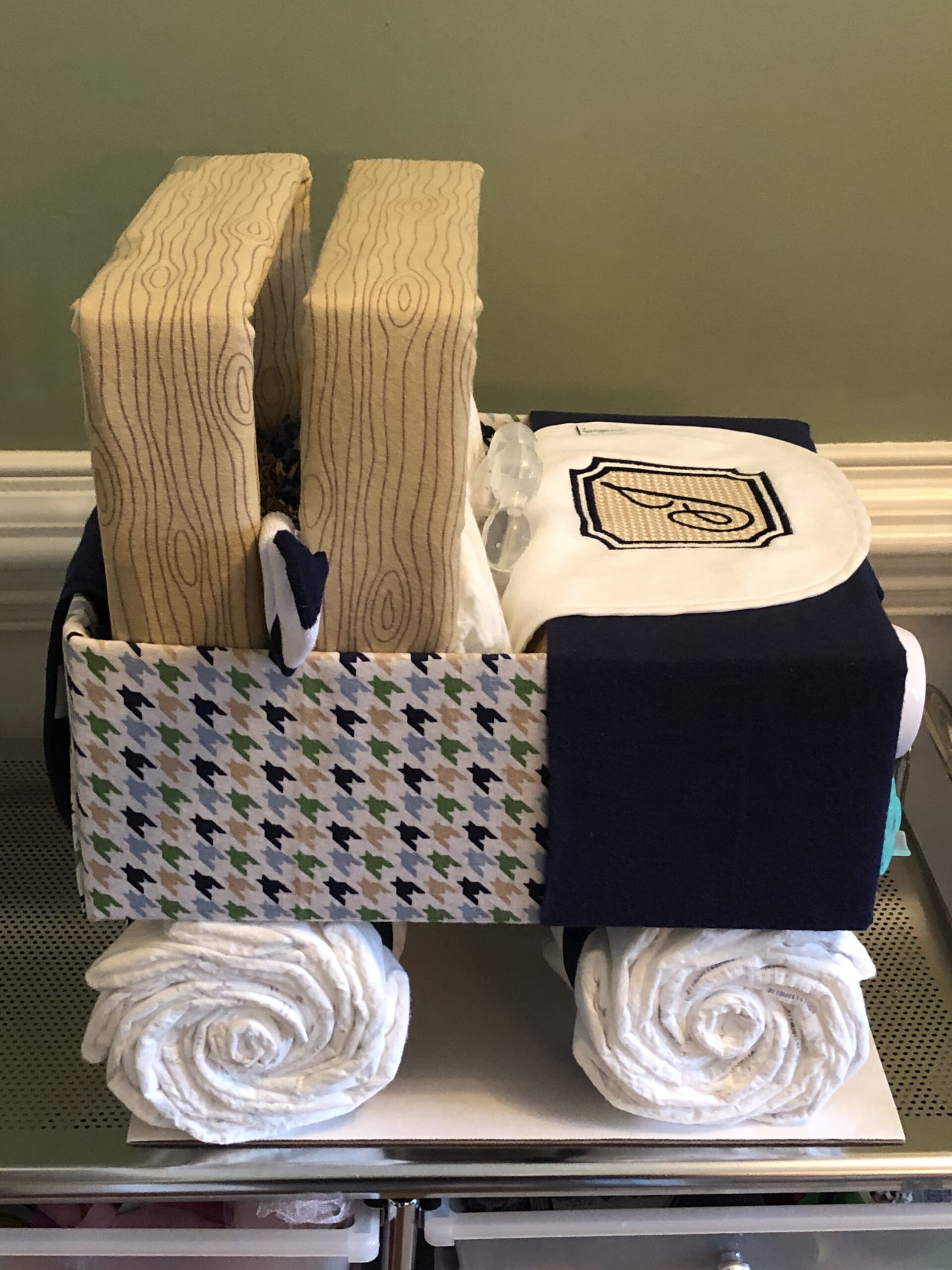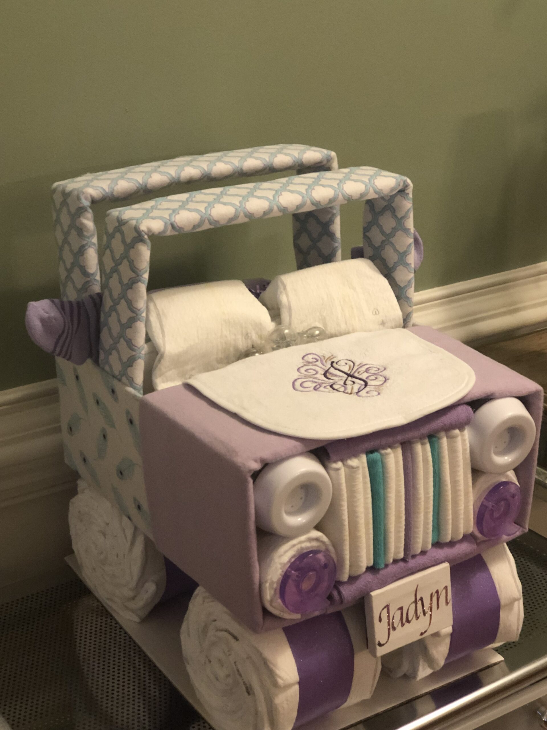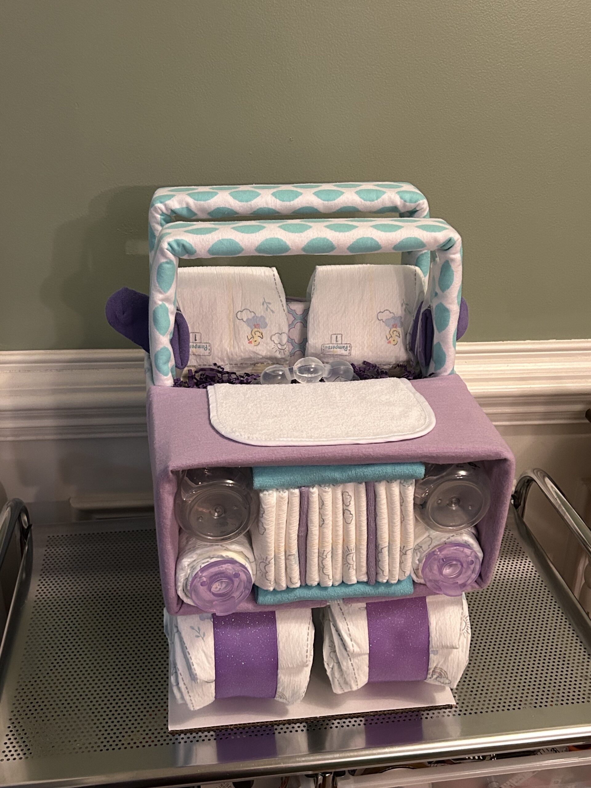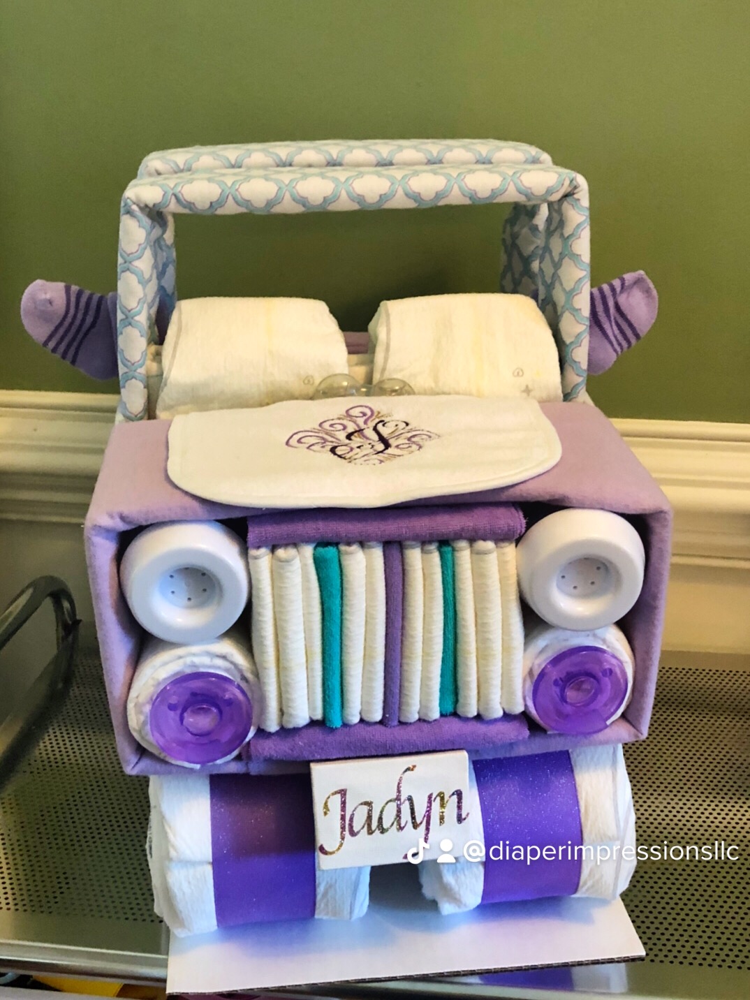 his Diaper 4×4 is the perfect gift for your next baby shower! It can serve as a gift set or a centerpiece! It is constructed of 50 size 1 pampers swaddlers, 5 matching receiving blankets, 2 6 oz tomme tippee baby bottles, 2 pacifiers, 4 washcloths, 2 bibs, 1 pair of baby socks, a teething ring with ribbons and bows to match. It can also be personalized with embroidered bibs and or a name tag.