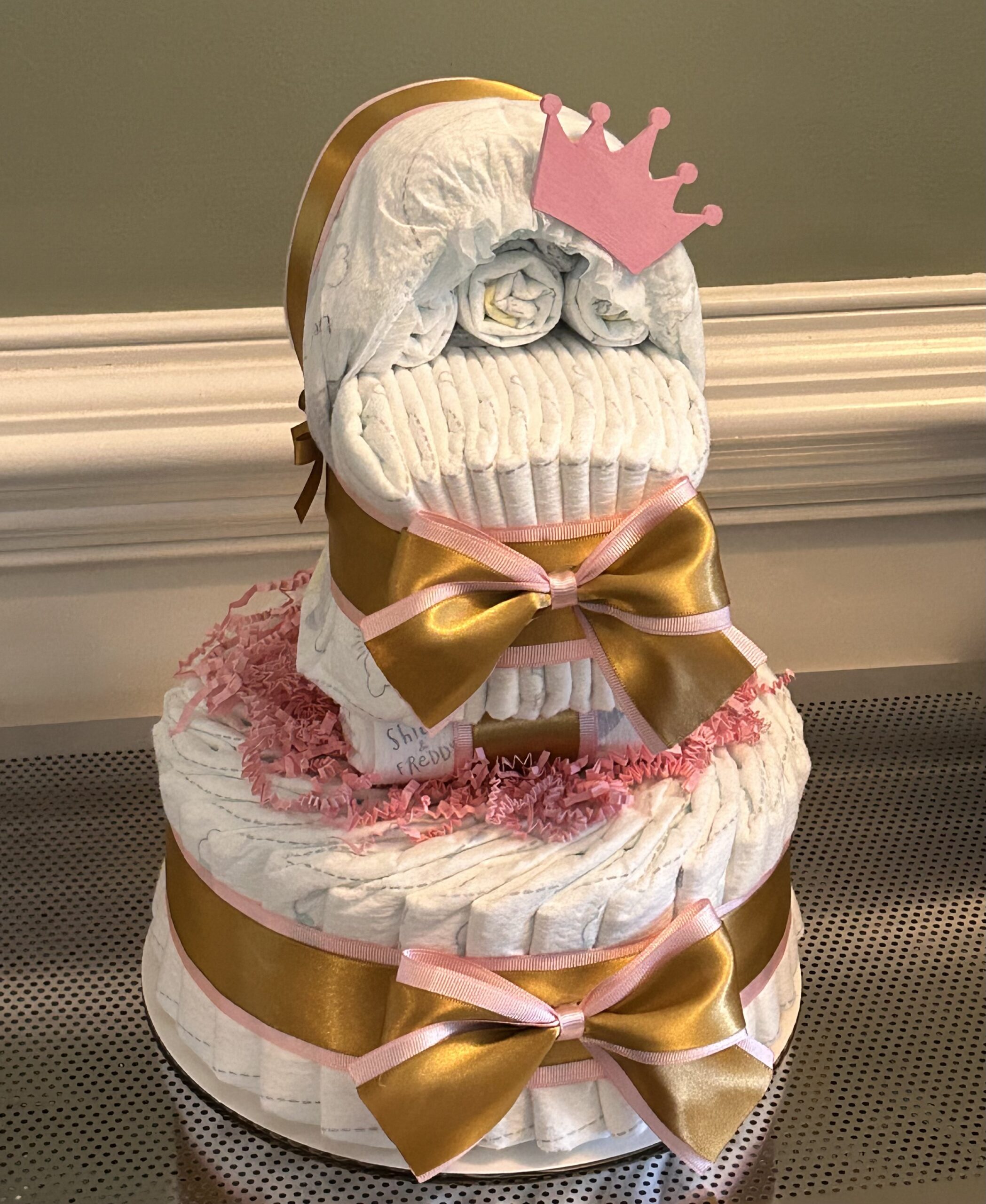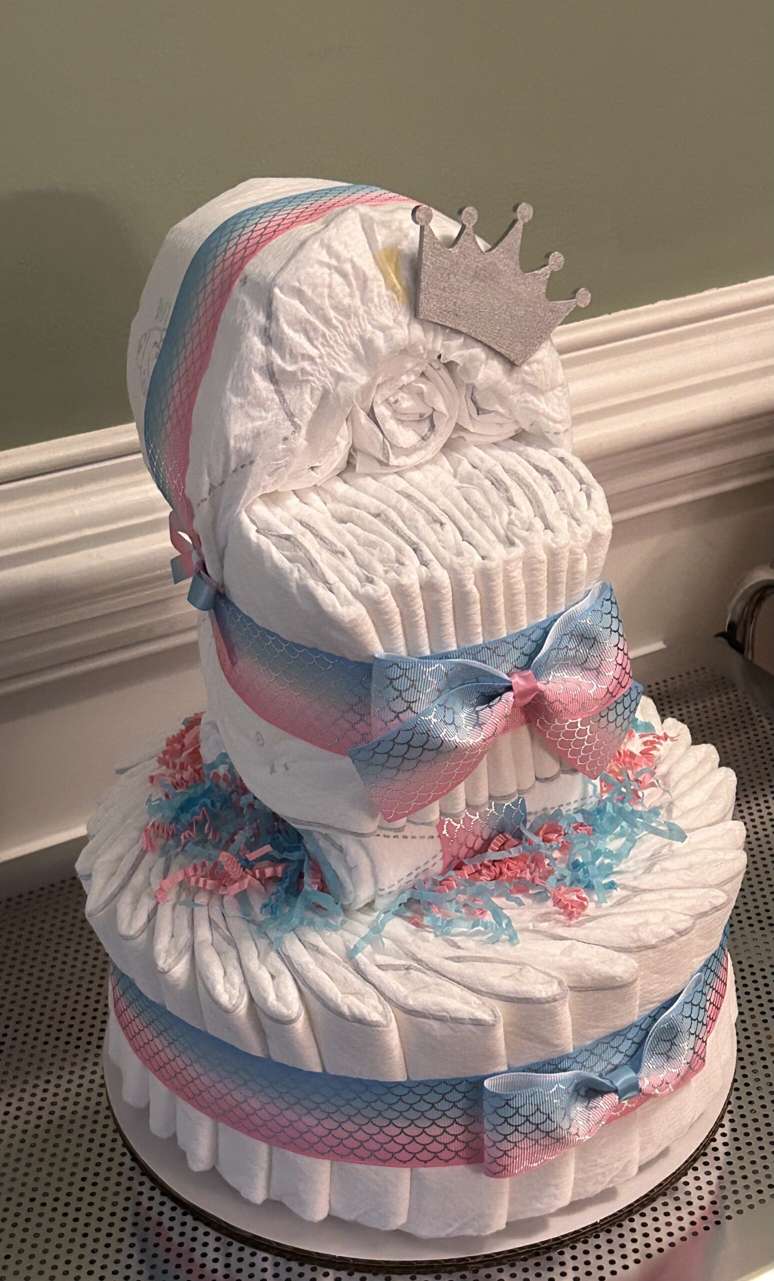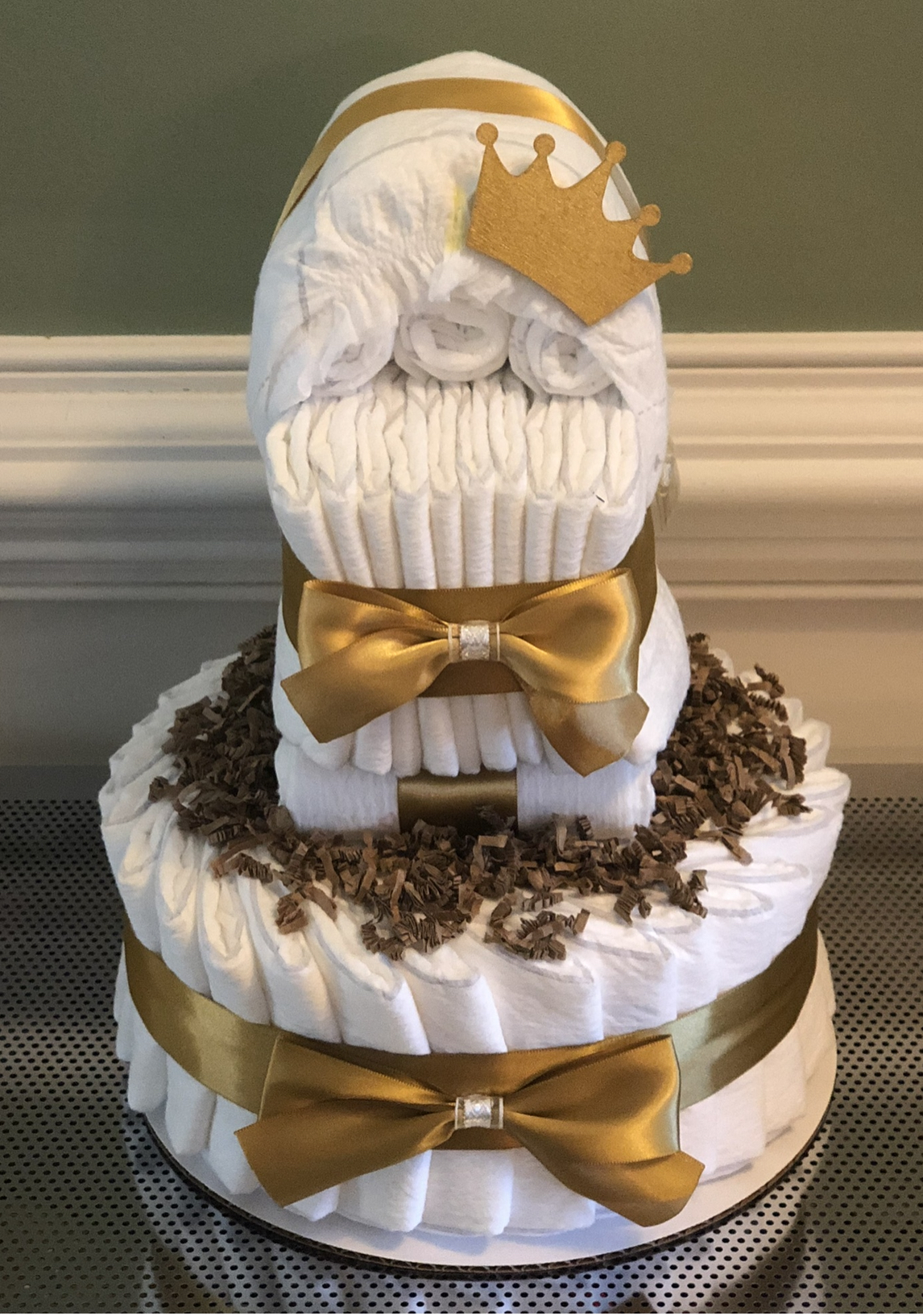 This Diaper Bassinet is a beautiful baby shower centerpiece or gift for your next baby shower! It is constructed of 50 size 1 pampers swaddlers with a decorative ribbon or small crown accent to match your colors or theme! It measures 10 inches wide and 10 inches tall. Don’t miss the chance to gift this unique one-of-a-kind diaper cake to a new Mom to be!