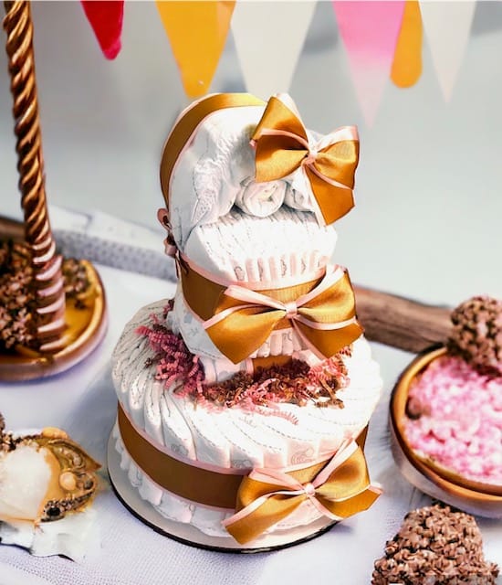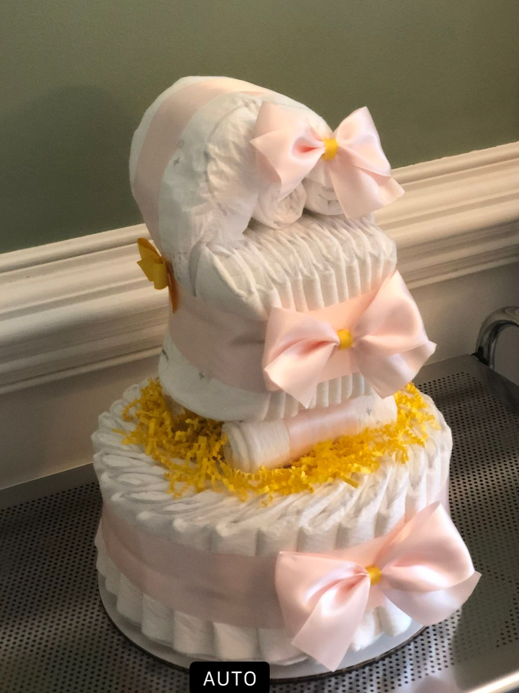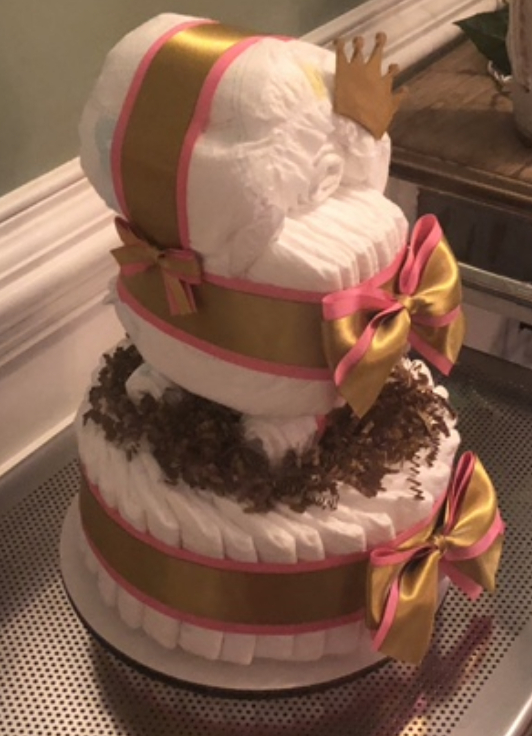 This Diaper Bassinet is a beautiful baby shower centerpiece or gift for your next baby shower! It is constructed of 50 size 1 pampers swaddlers with a decorative ribbon or small crown accent to match your colors or theme! It measures 10 inches wide and 10 inches tall. Don’t miss the chance to gift this unique one-of-a-kind diaper cake to a new Mom to be!