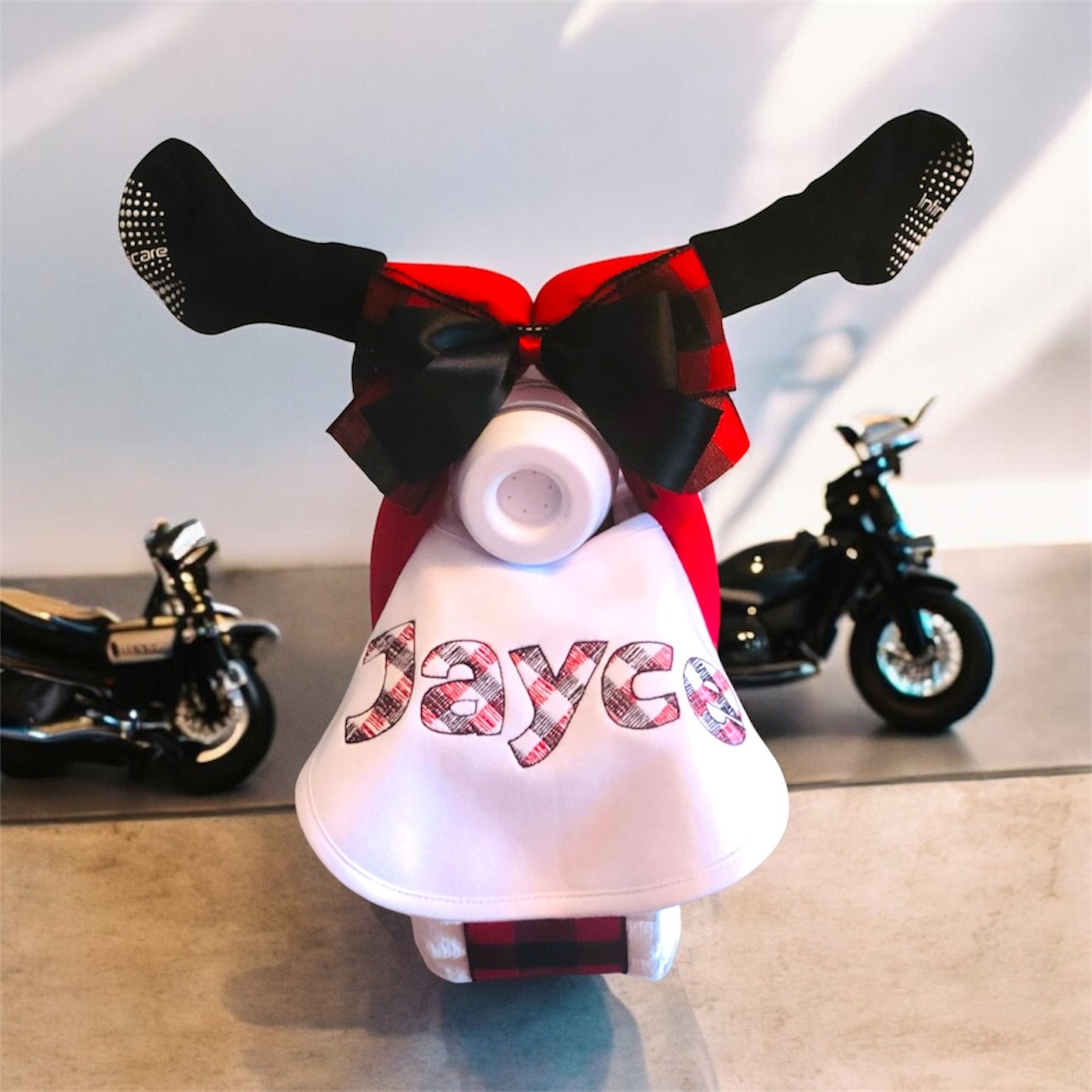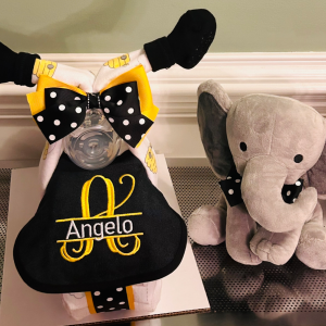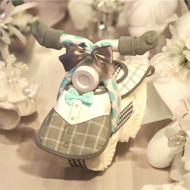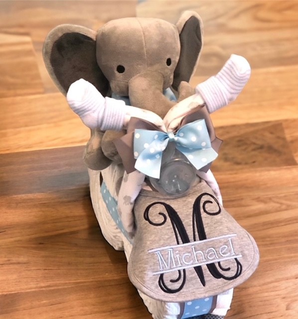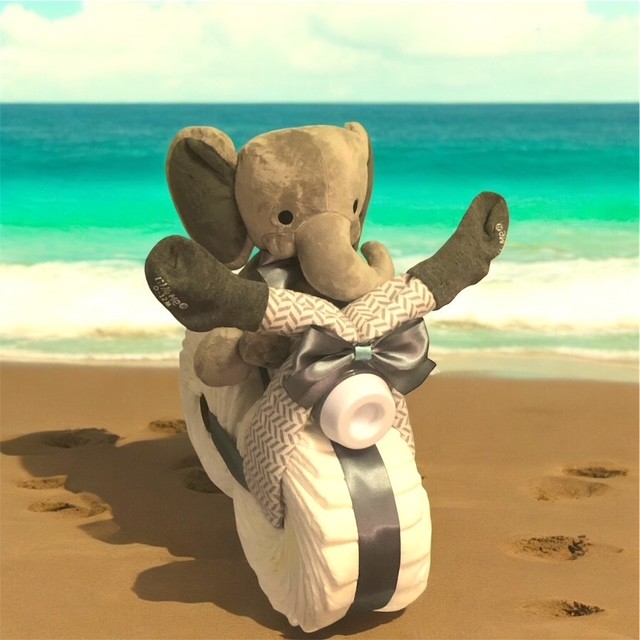Let this Diaper Motorcycle make your entrance to the baby shower a memorable one! It is constructed of 40 size 1 pampers swaddlers, a receiving blanket, 1 tommee tippee bottle, and 1 pair of baby socks with ribbons and bows to match! An embroidered bib is also available for an additional cost!