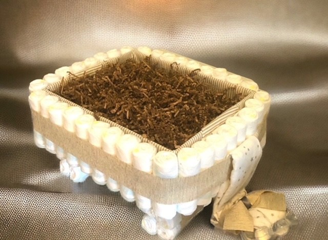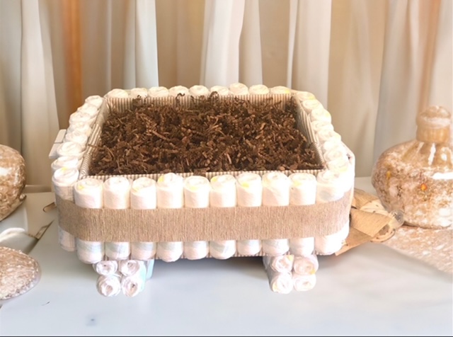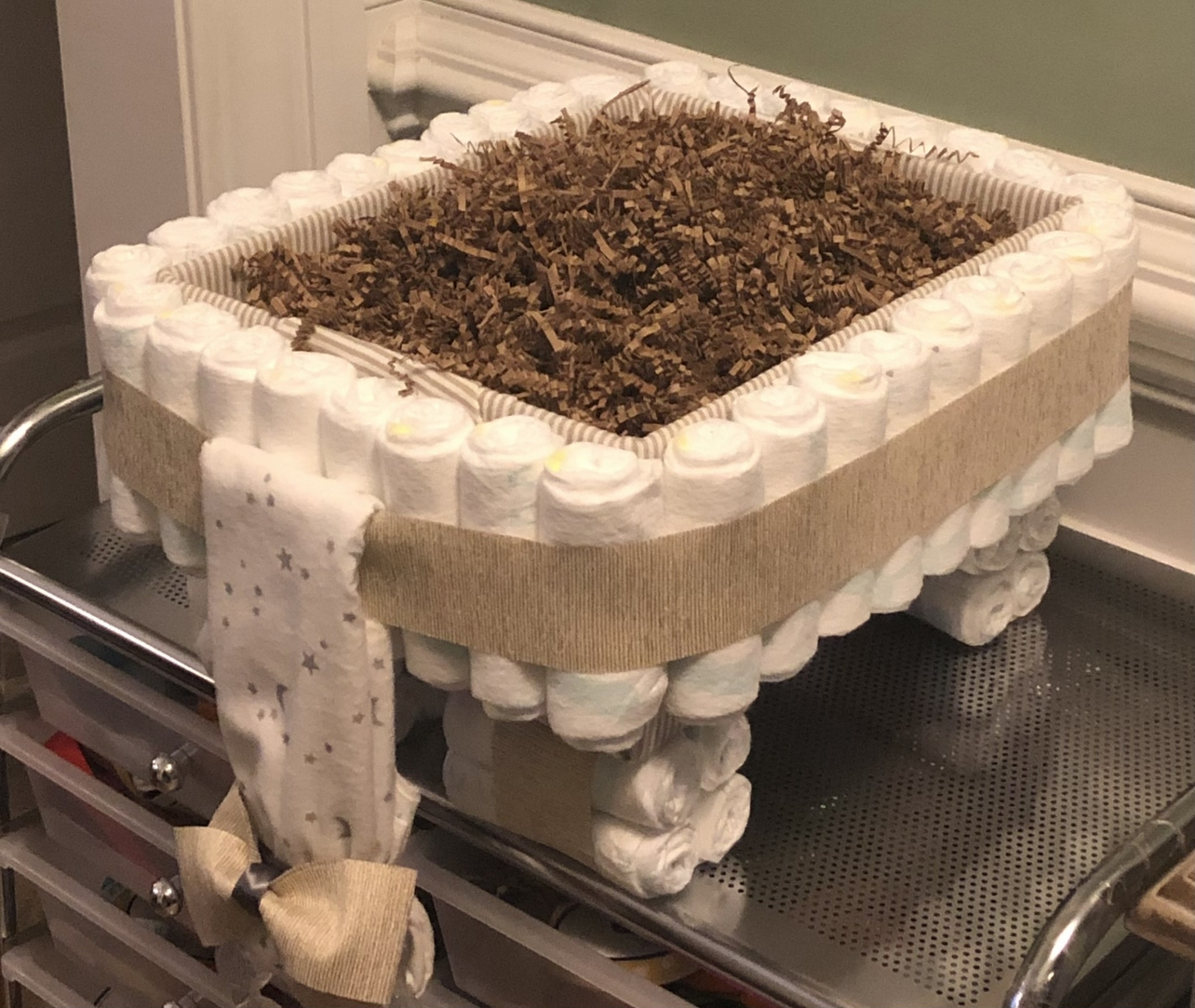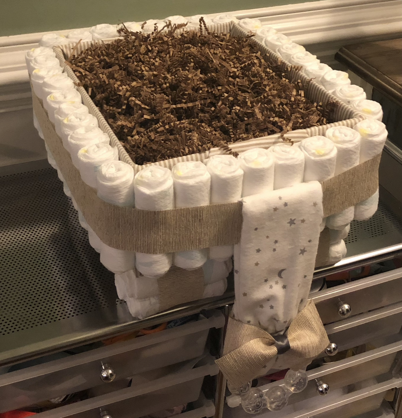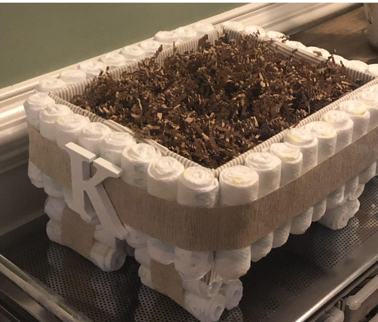 This Diaper wagon will be the hit of any baby shower. It is handcrafted and can be constructed to fit your personal colors or theme! It is constructed of a small box (13x10x5) approximately 50 size 1 pampers swaddlers, 2 receiving blankets,1 teething ring,1 large initial, with ribbons and confetti to match! Dove Baby wipes, lotion, and body wash can be purchased for an additional cost.