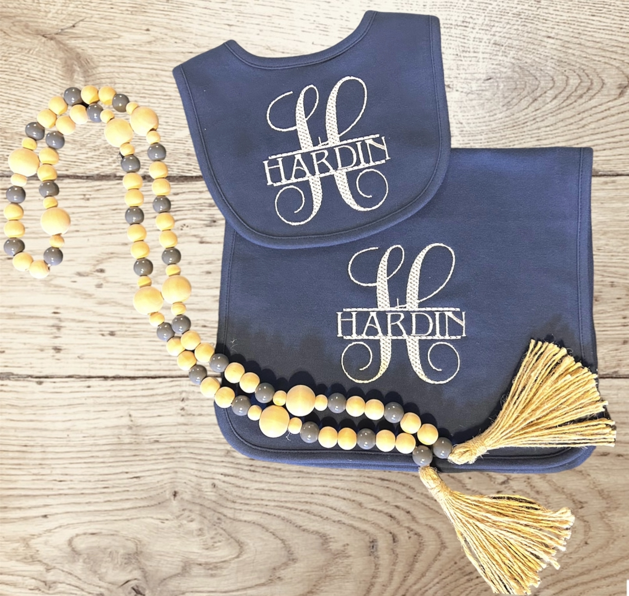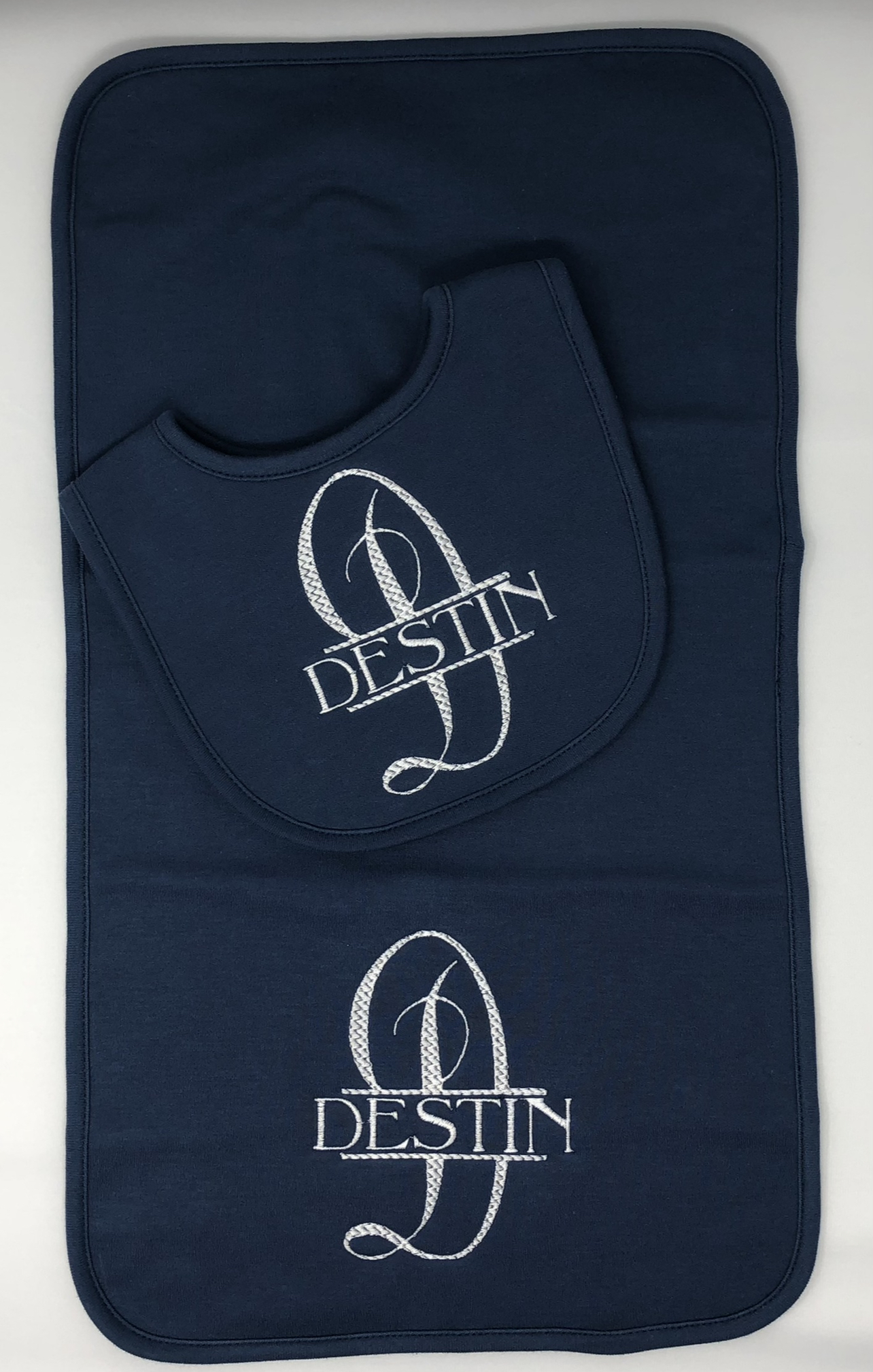 Adorable Embroidered Bib and Burp Cloth set. This bib and burp cloth are both 100% cotton. The bib measures 8.5×11 inches and the burp cloth measures 11x 20 inches. This set is perfect for keeping your little one clean during mealtime and beyond! The adjustable closure ensures a comfortable fit for babies of all sizes. Whether you are looking for a practical gift for an upcoming baby shower or if you’re looking to add to your little one’s wardrobe, this gift will not disappoint! It is currently available in baby blue, yellow, navy, gray, and white. Please be sure to enter the Baby’s name for the monogram in the customization box before check out.