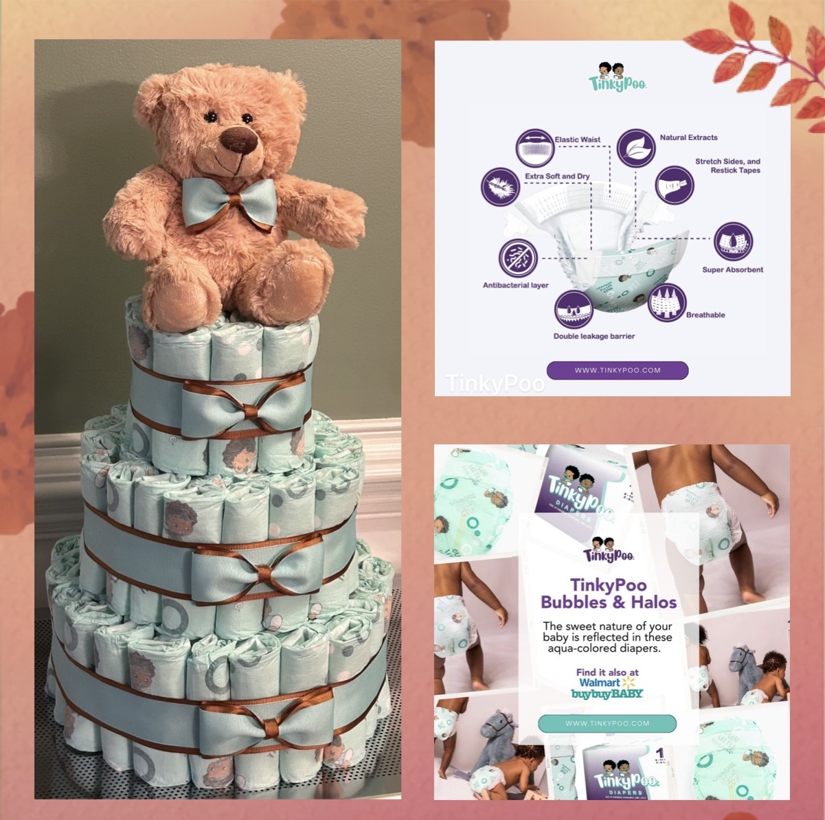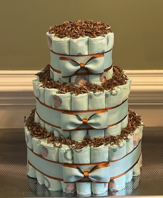 A Diaper cake is a delightful and practical gift idea for any baby shower! This Teddy Bear Diaper Cake combines the style and design of a diaper impression with the dependable, echo friendly, plant based Tinky Poo Diapers. It is constructed of 96 rolled size 2 Bubbles and Halo style Tinky Poo Diapers, 1 adorable 8 inch teddy bear with ribbons and bows to match. Don’t miss the chance to gift this unique diaper impression!